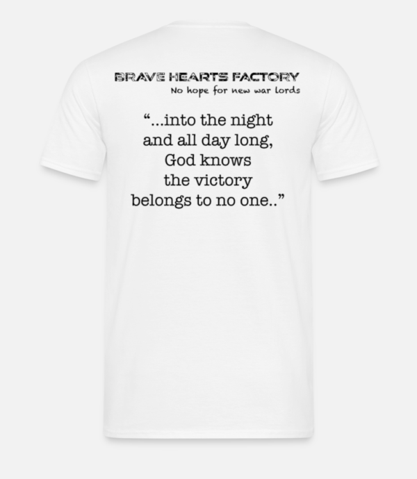 La T-Shirt ufficiale del brano “No Hope For New War Lords”. Bianca come una colomba della pace, comprende la stampa della copertina del singolo sul fronte e i versi più rappresentativi della canzone sul retro. Ideale da sfoggiare ai concerti per essere riconosciuto come un vero fan della band!